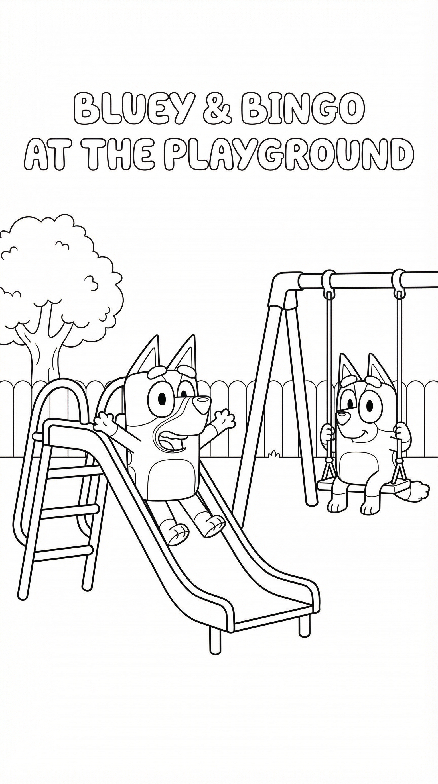Bluey and Bingo at the Playground is a free printable coloring page from our Bluey Coloring Pages collection. It’s suitable for kids ages 6-8 and can be downloaded as PDF or image directly at home. No account required — just click Download PDF or Download image above.