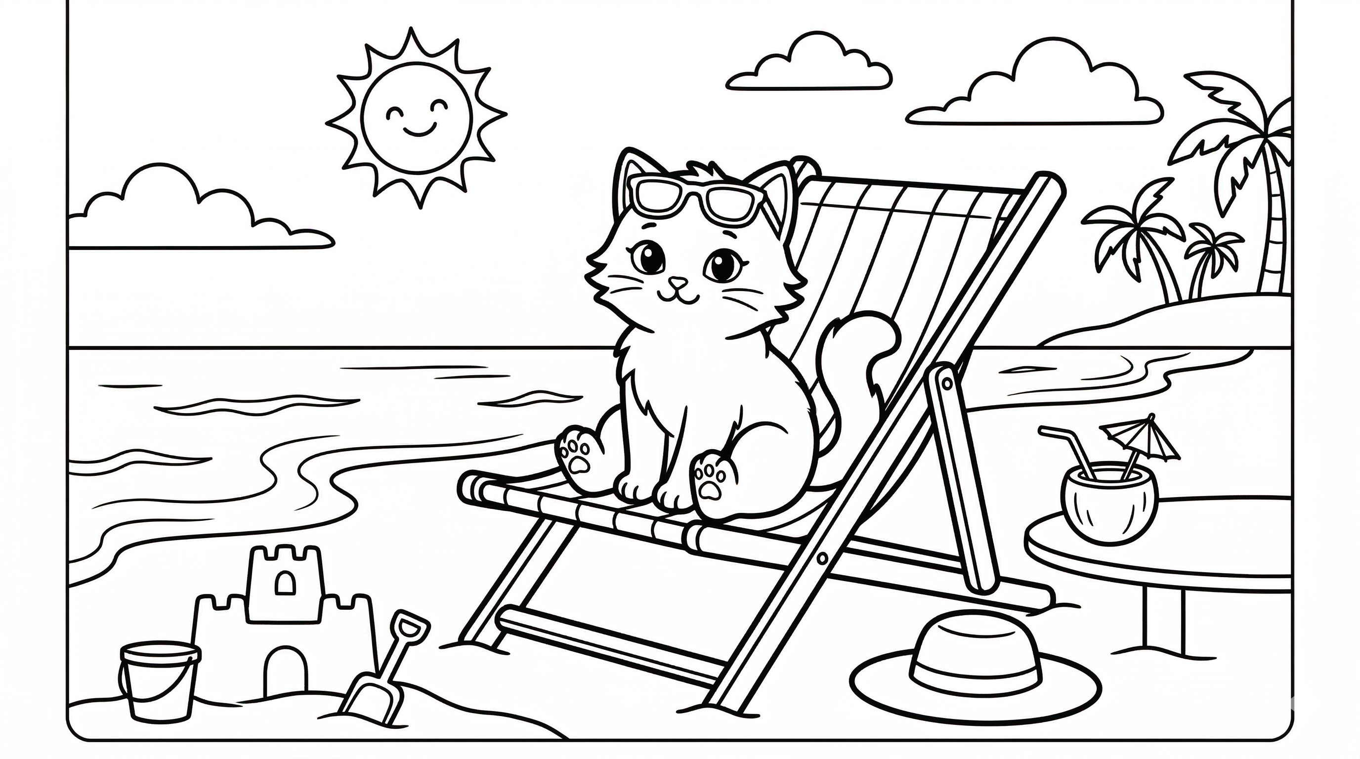 Cat on Beach Chair Coloring Page is a free printable coloring page from our Cat Coloring Pages collection. It’s suitable for kids ages 6-8 and can be downloaded as PDF or image directly at home. No account required — just click Download PDF or Download image above.