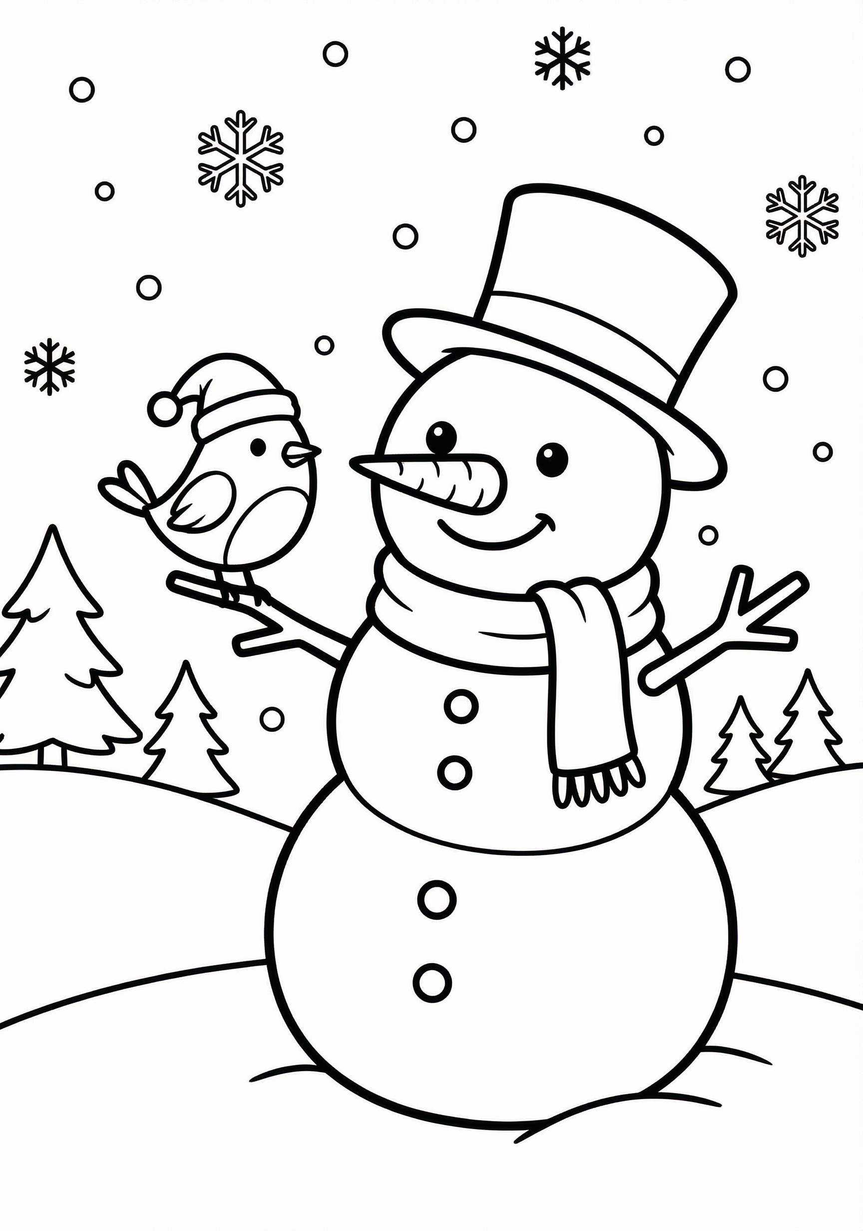 Snowman and Bird Coloring Page is a free printable coloring page from our Christmas Coloring Pages collection. It’s suitable for kids ages 6-8 and can be downloaded as PDF or image directly at home. No account required — just click Download PDF or Download image above.