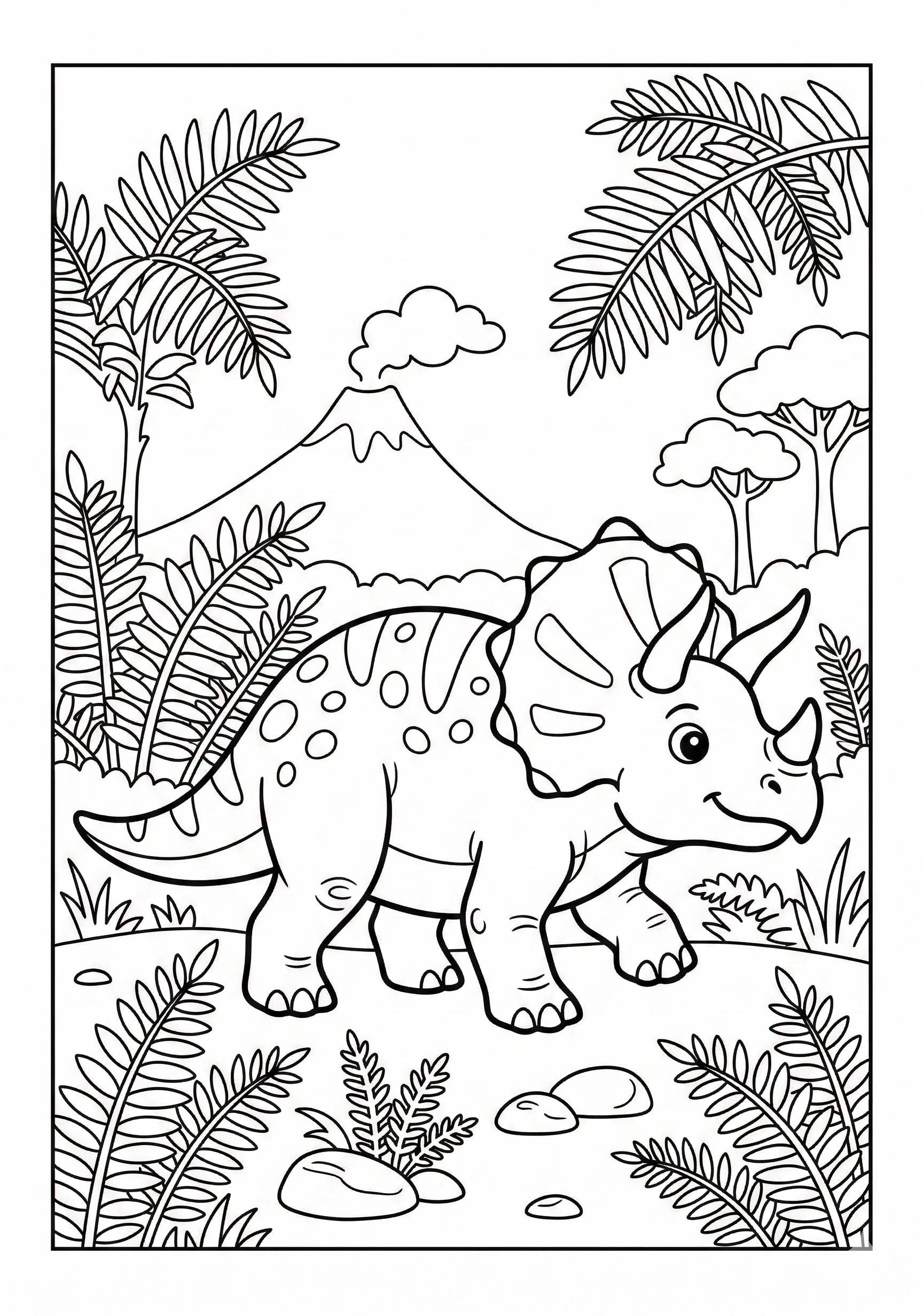 Triceratops in Ferns Coloring Page is a free printable coloring page from our Dinosaur Coloring Pages collection. It’s suitable for kids ages 6-8 and can be downloaded as PDF or image directly at home. No account required — just click Download PDF or Download image above.