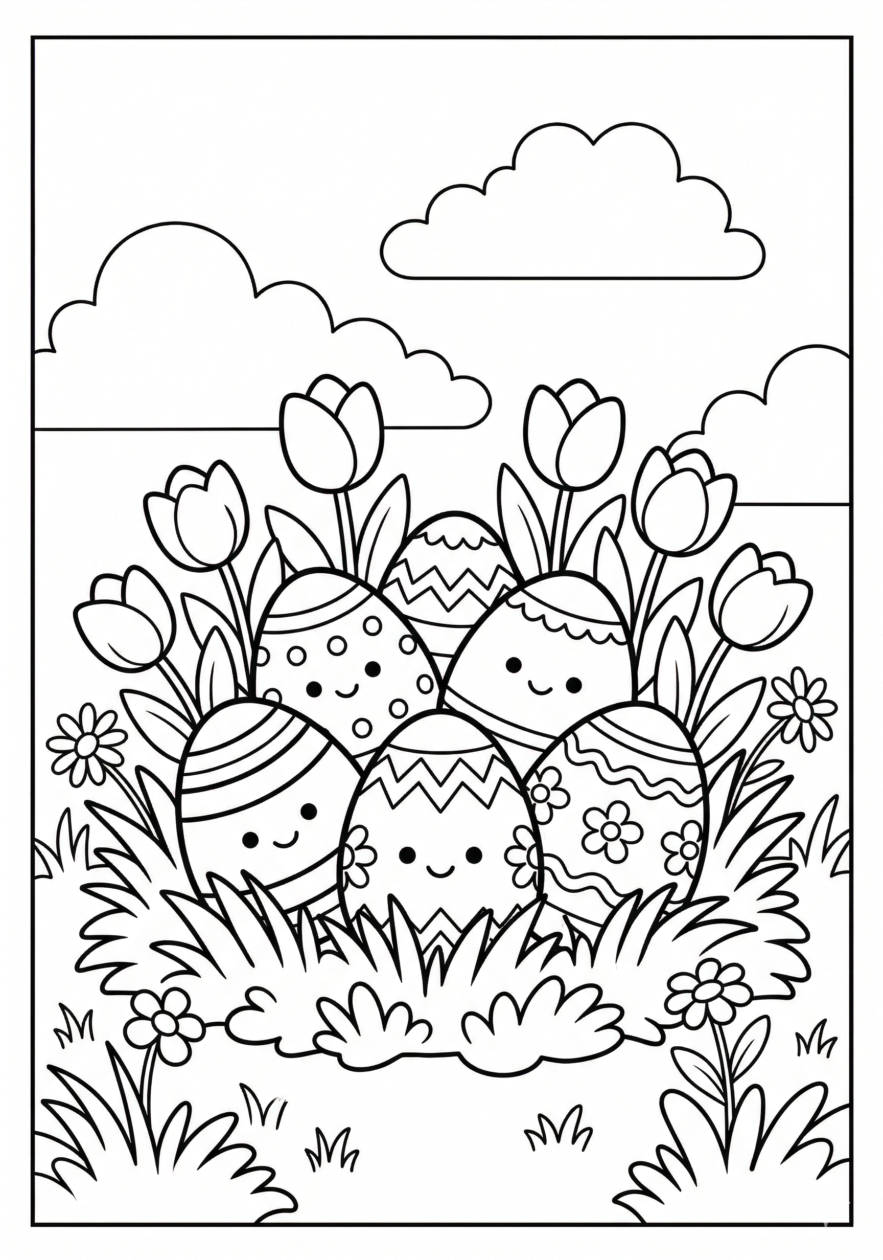 Easter Eggs with Tulips Coloring Page is a free printable coloring page from our Easter Coloring Pages collection. It’s suitable for kids ages 6-8 and can be downloaded as PDF or image directly at home. No account required — just click Download PDF or Download image above.