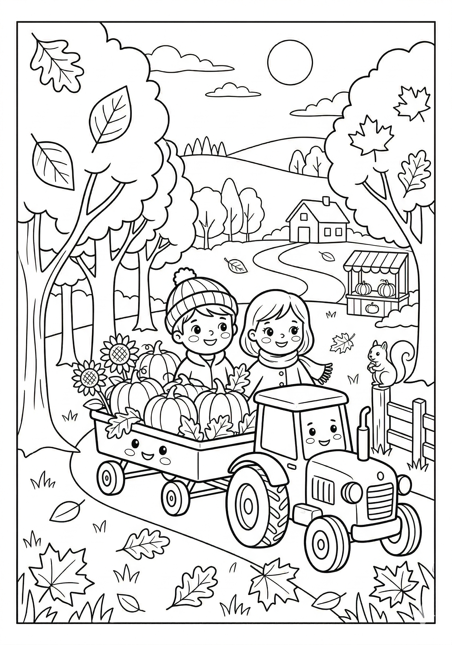 Pumpkin Wagon Ride Coloring Page is a free printable coloring page from our Fall Coloring Pages collection. It’s suitable for kids ages 6-8 and can be downloaded as PDF or image directly at home. No account required — just click Download PDF or Download image above.