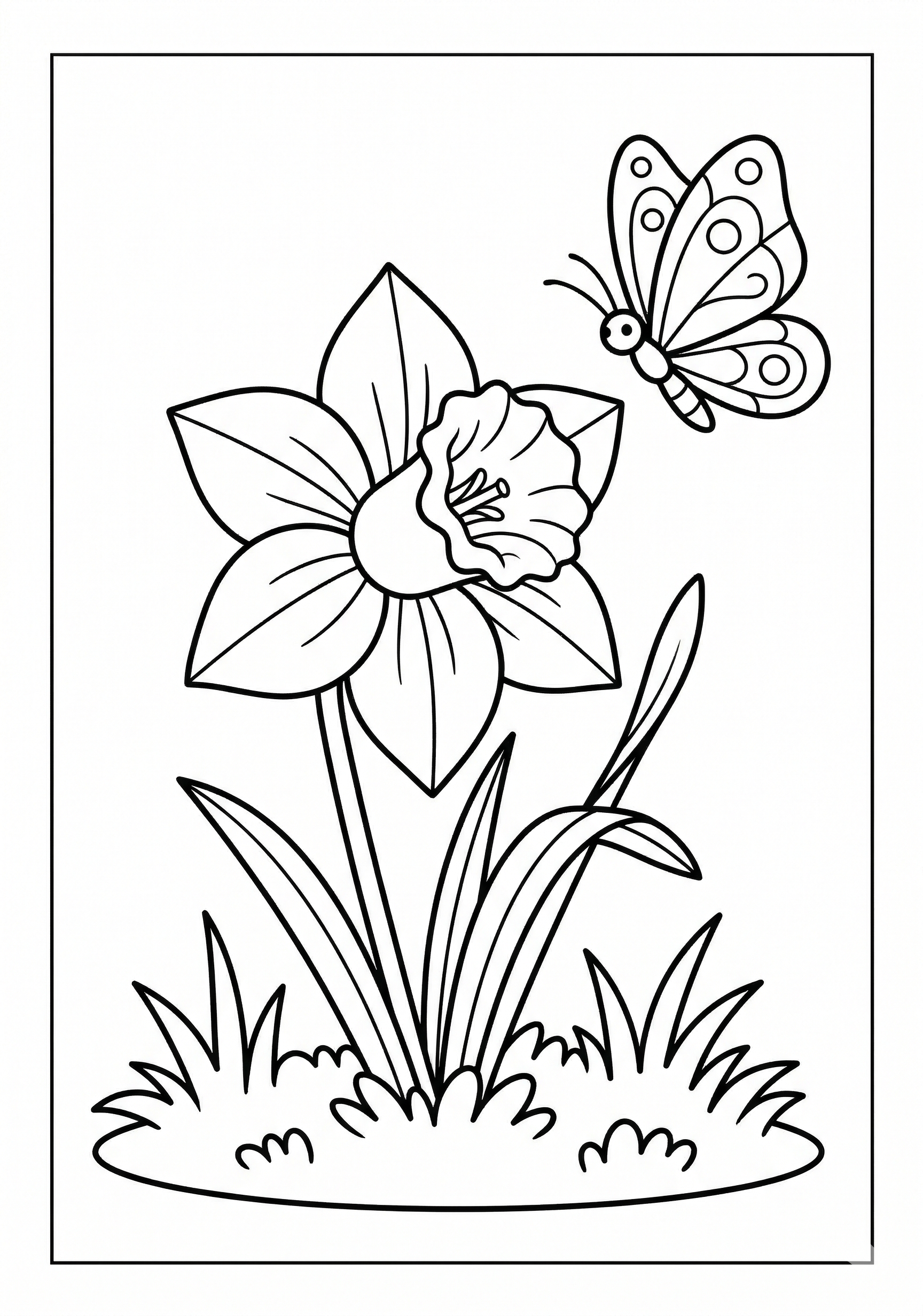 Daffodil with Butterfly Coloring Page is a free printable coloring page from our Flower Coloring Pages collection. It’s suitable for kids ages 6-8 and can be downloaded as PDF or image directly at home. No account required — just click Download PDF or Download image above.