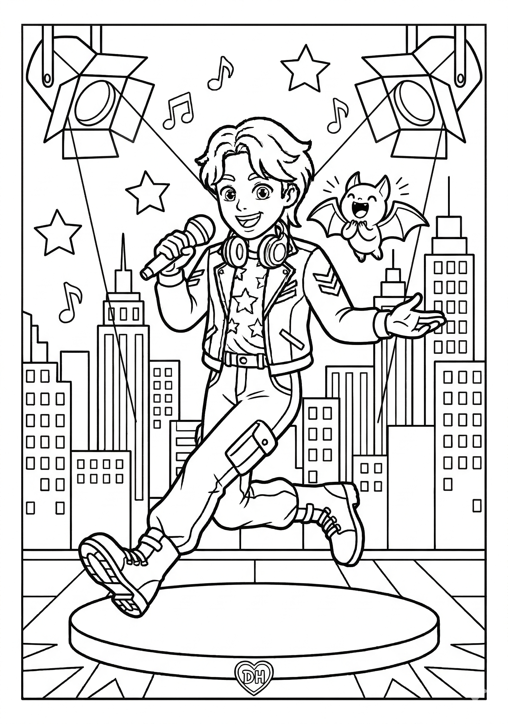 Kpop Demon Hunter under Spotlights is a free printable coloring page from our Kpop Demon Hunters Coloring Pages collection. It’s suitable for kids ages 6-8 and can be downloaded as PDF or image directly at home. No account required — just click Download PDF or Download image above.