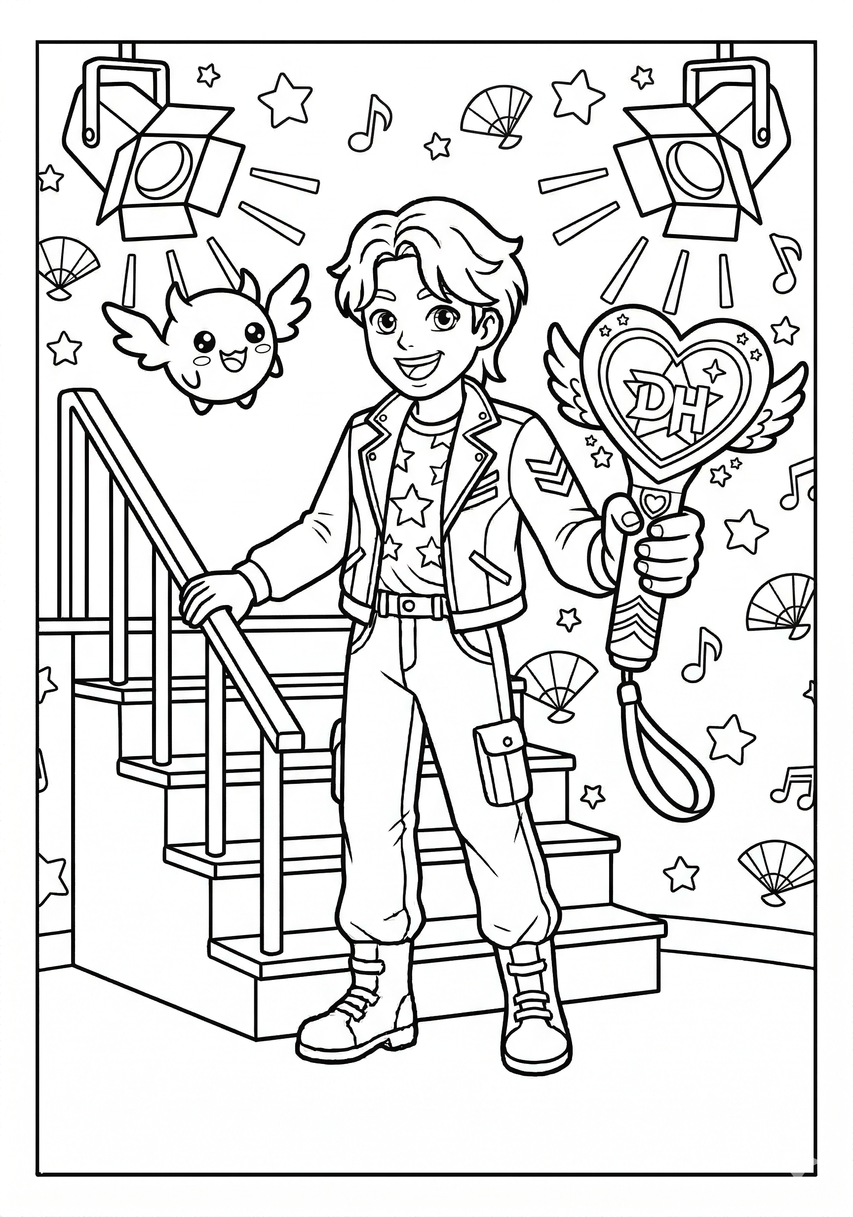 Kpop Demon Hunter with Big Heart Lightstick is a free printable coloring page from our Kpop Demon Hunters Coloring Pages collection. It’s suitable for kids ages 6-8 and can be downloaded as PDF or image directly at home. No account required — just click Download PDF or Download image above.