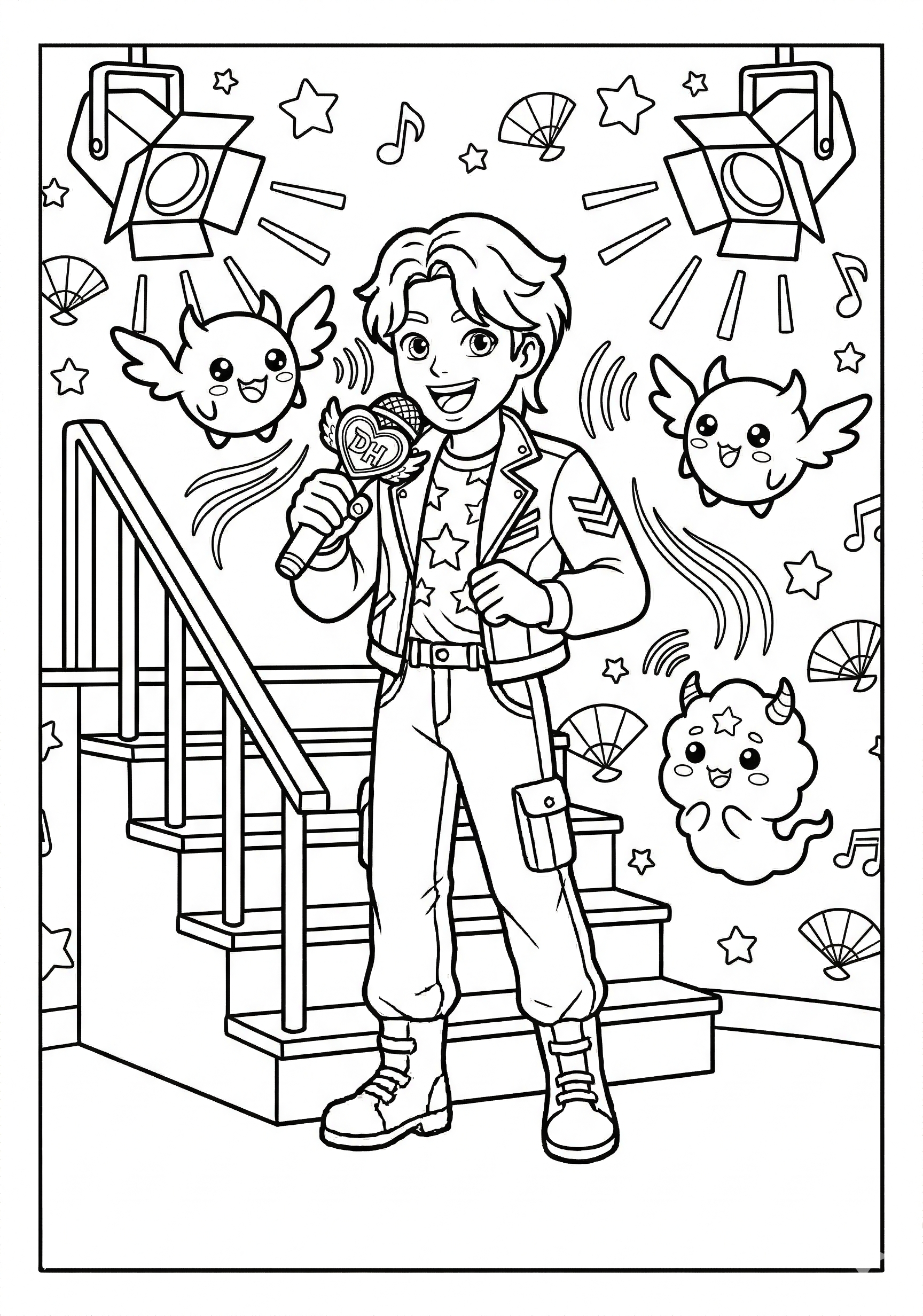 Kpop Demon Hunter with Sound Waves is a free printable coloring page from our Kpop Demon Hunters Coloring Pages collection. It’s suitable for kids ages 6-8 and can be downloaded as PDF or image directly at home. No account required — just click Download PDF or Download image above.