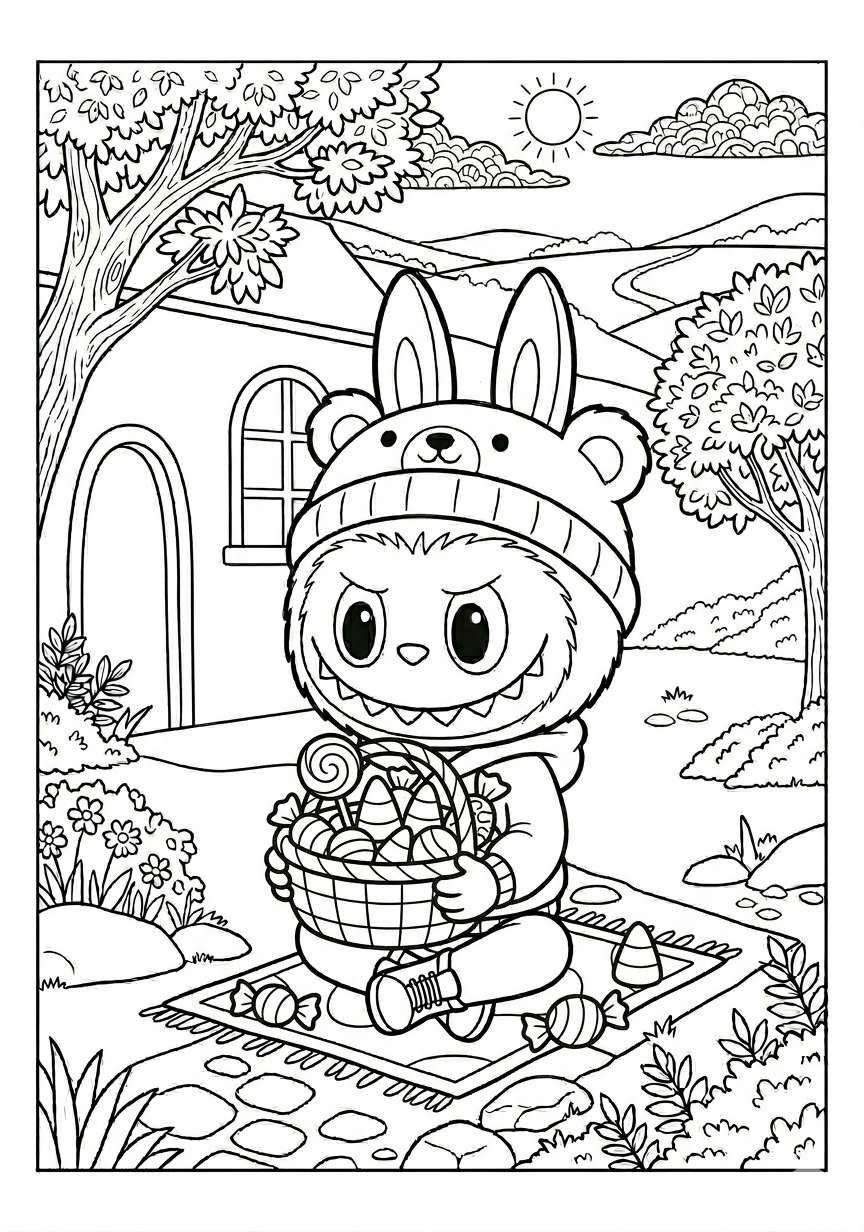 Labubu with Candy Basket Coloring Page is a free printable coloring page from our Labubu Coloring Pages collection. It’s suitable for kids ages 6-8 and can be downloaded as PDF or image directly at home. No account required — just click Download PDF or Download image above.