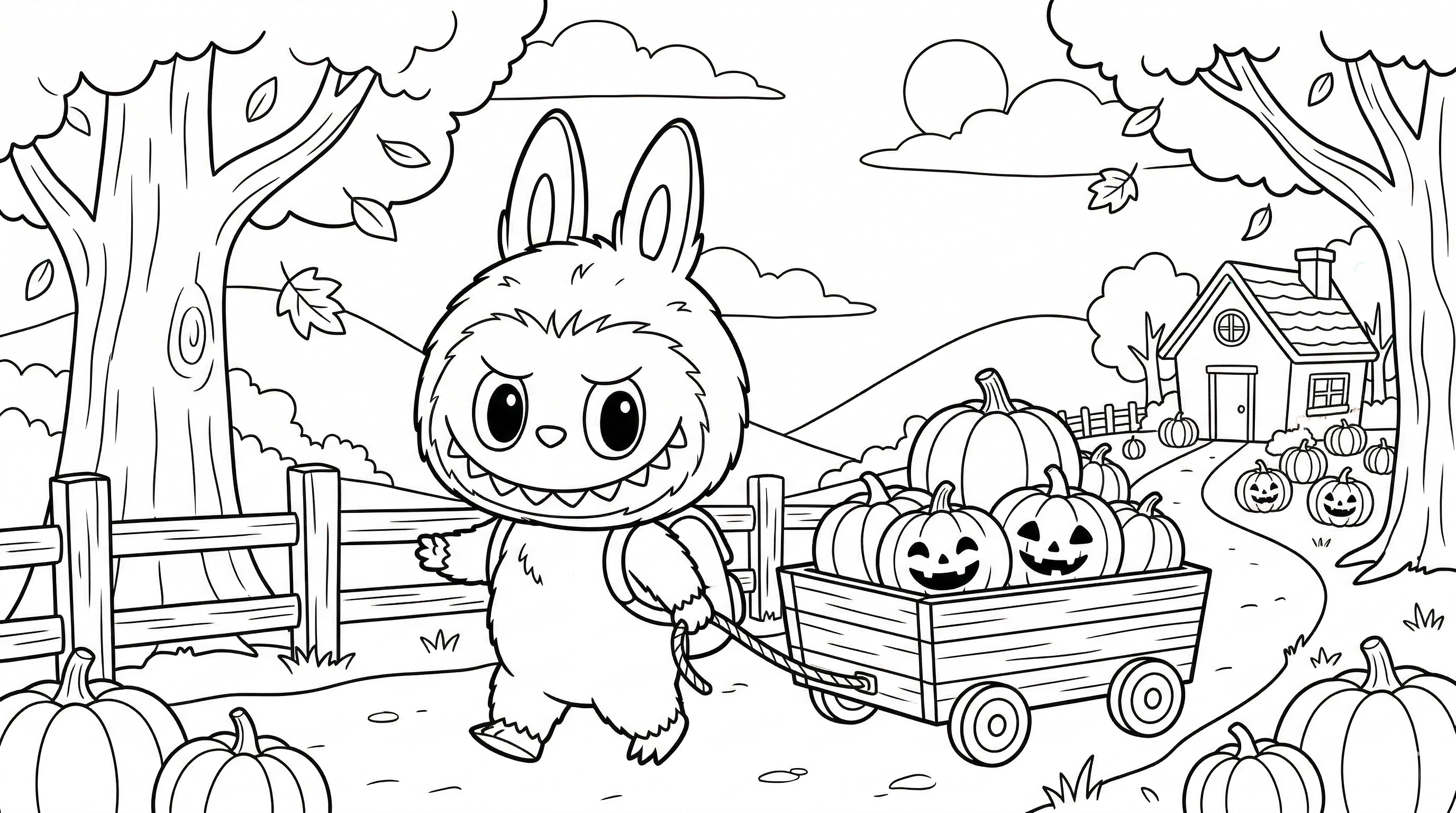 Labubu with Pumpkin Wagon Coloring Page is a free printable coloring page from our Labubu Coloring Pages collection. It’s suitable for kids ages 6-8 and can be downloaded as PDF or image directly at home. No account required — just click Download PDF or Download image above.