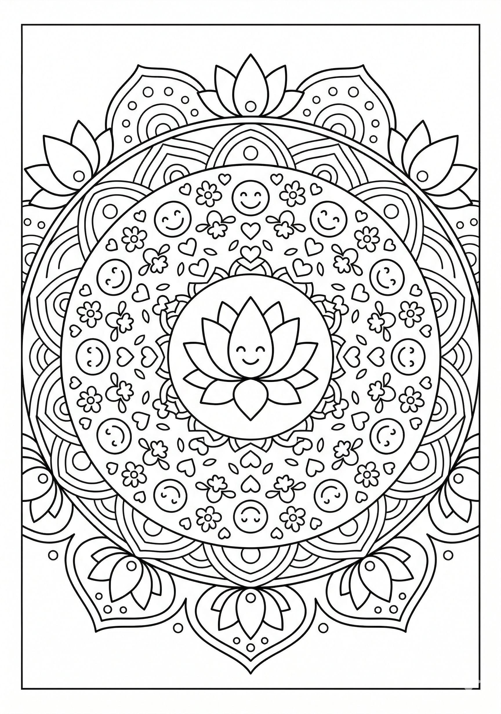 Cheerful Lotus Ring Mandala Coloring Page is a free printable coloring page from our Mandala Coloring Pages collection. It’s suitable for kids ages 6-8 and can be downloaded as PDF or image directly at home. No account required — just click Download PDF or Download image above.
