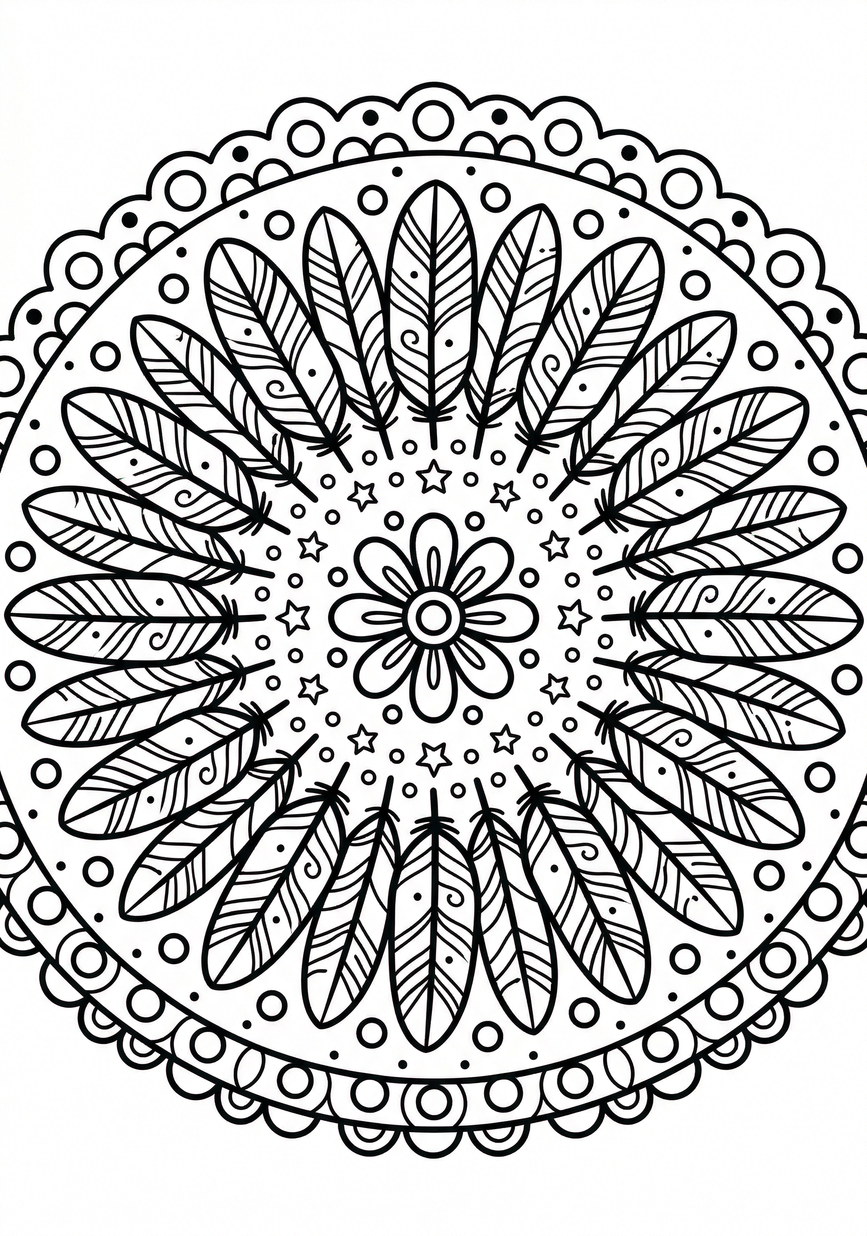 Feather Ring Mandala Coloring Page is a free printable coloring page from our Mandala Coloring Pages collection. It’s suitable for kids ages 6-8 and can be downloaded as PDF or image directly at home. No account required — just click Download PDF or Download image above.