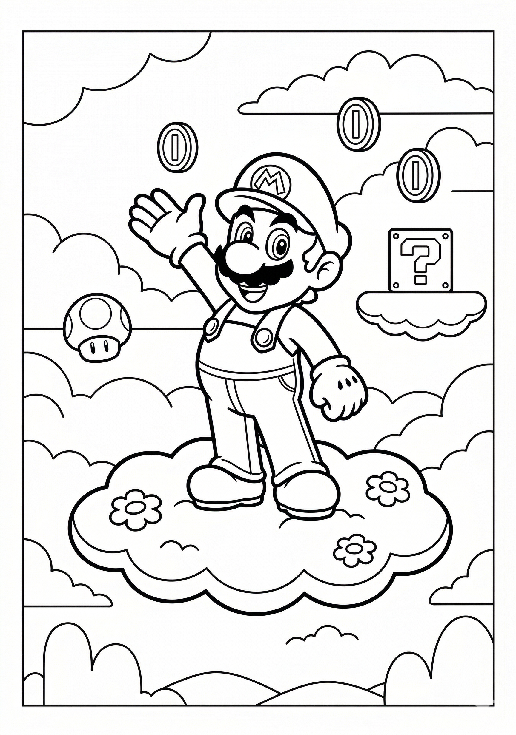 Mario and Cloudy Sky Scene Coloring Page is a free printable coloring page from our Mario Coloring Pages collection. It’s suitable for kids ages 6-8 and can be downloaded as PDF or image directly at home. No account required — just click Download PDF or Download image above.