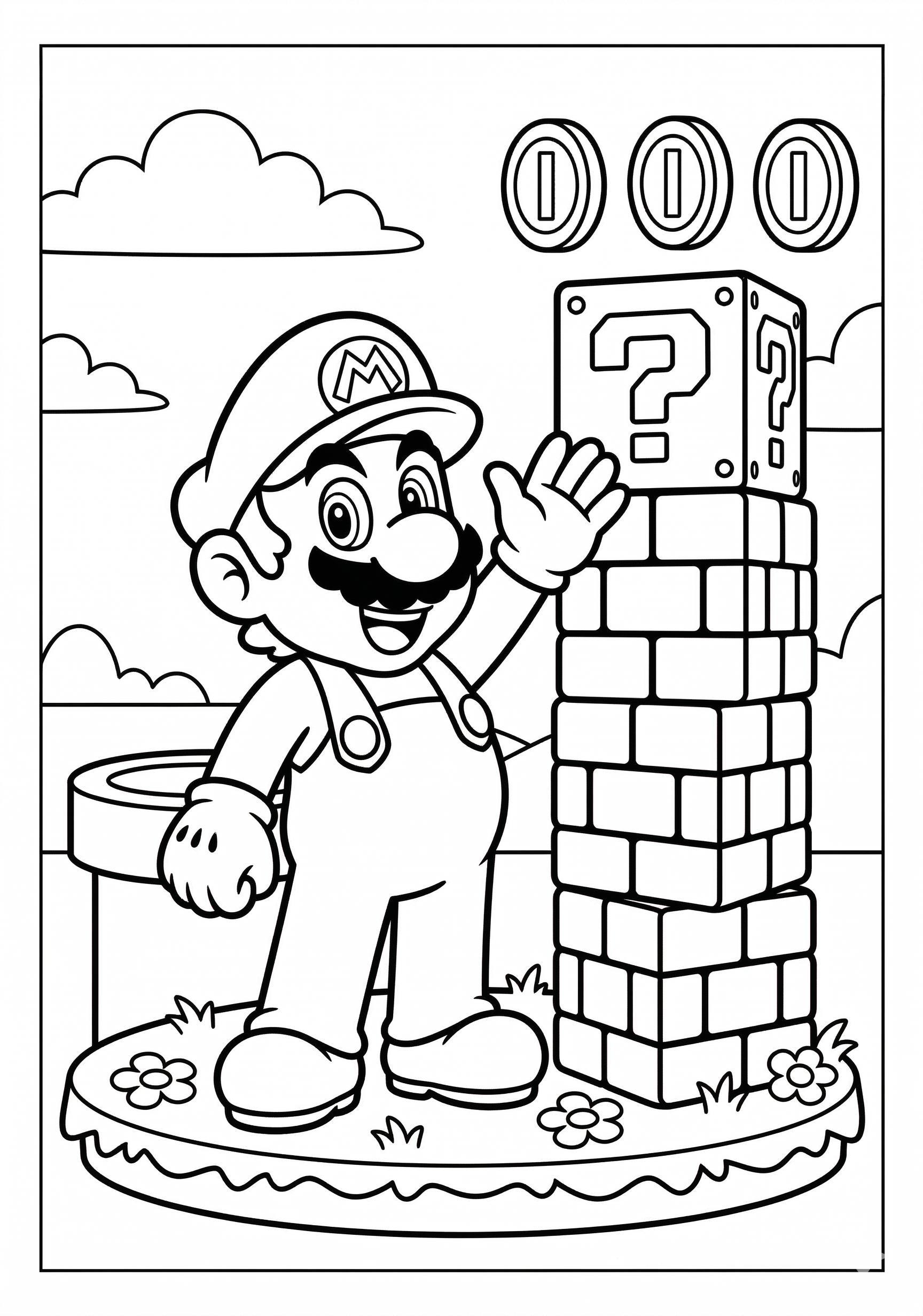 Mario with Block Stack Coloring Page is a free printable coloring page from our Mario Coloring Pages collection. It’s suitable for kids ages 6-8 and can be downloaded as PDF or image directly at home. No account required — just click Download PDF or Download image above.