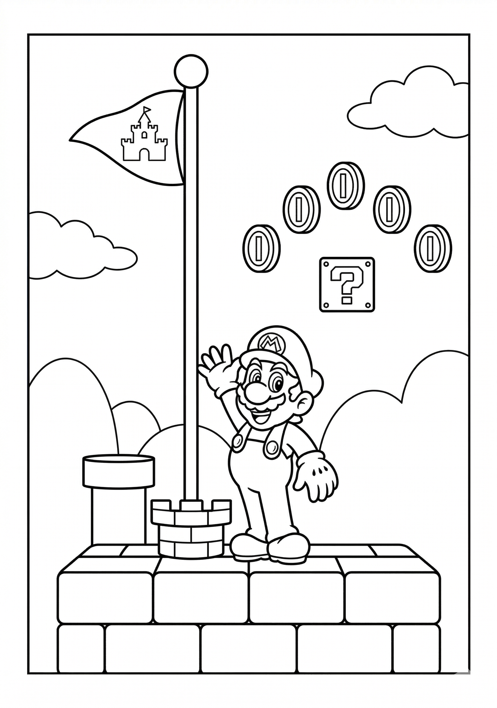 Mario with Flag Pole Coloring Page is a free printable coloring page from our Mario Coloring Pages collection. It’s suitable for kids ages 6-8 and can be downloaded as PDF or image directly at home. No account required — just click Download PDF or Download image above.