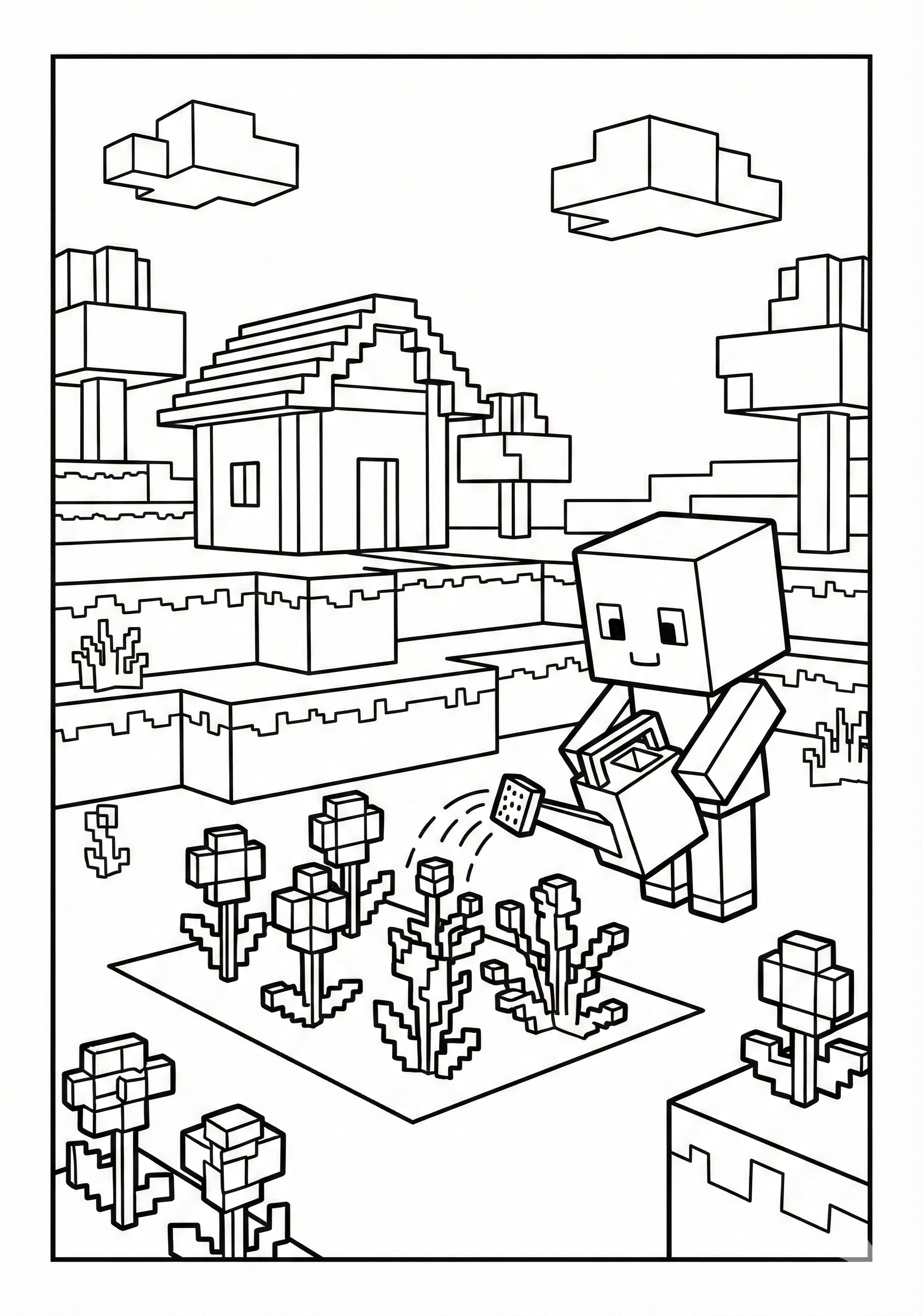Block Garden Scene is a free printable coloring page from our Minecraft Coloring Pages collection. It’s suitable for kids ages 6-8 and can be downloaded as PDF or image directly at home. No account required — just click Download PDF or Download image above.