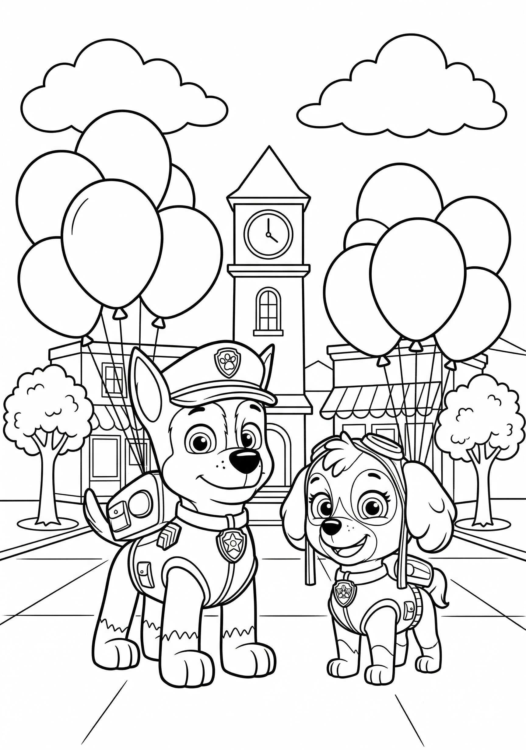 Chase and Skye with Balloons is a free printable coloring page from our Paw Patrol Coloring Pages collection. It’s suitable for kids ages 6-8 and can be downloaded as PDF or image directly at home. No account required — just click Download PDF or Download image above.