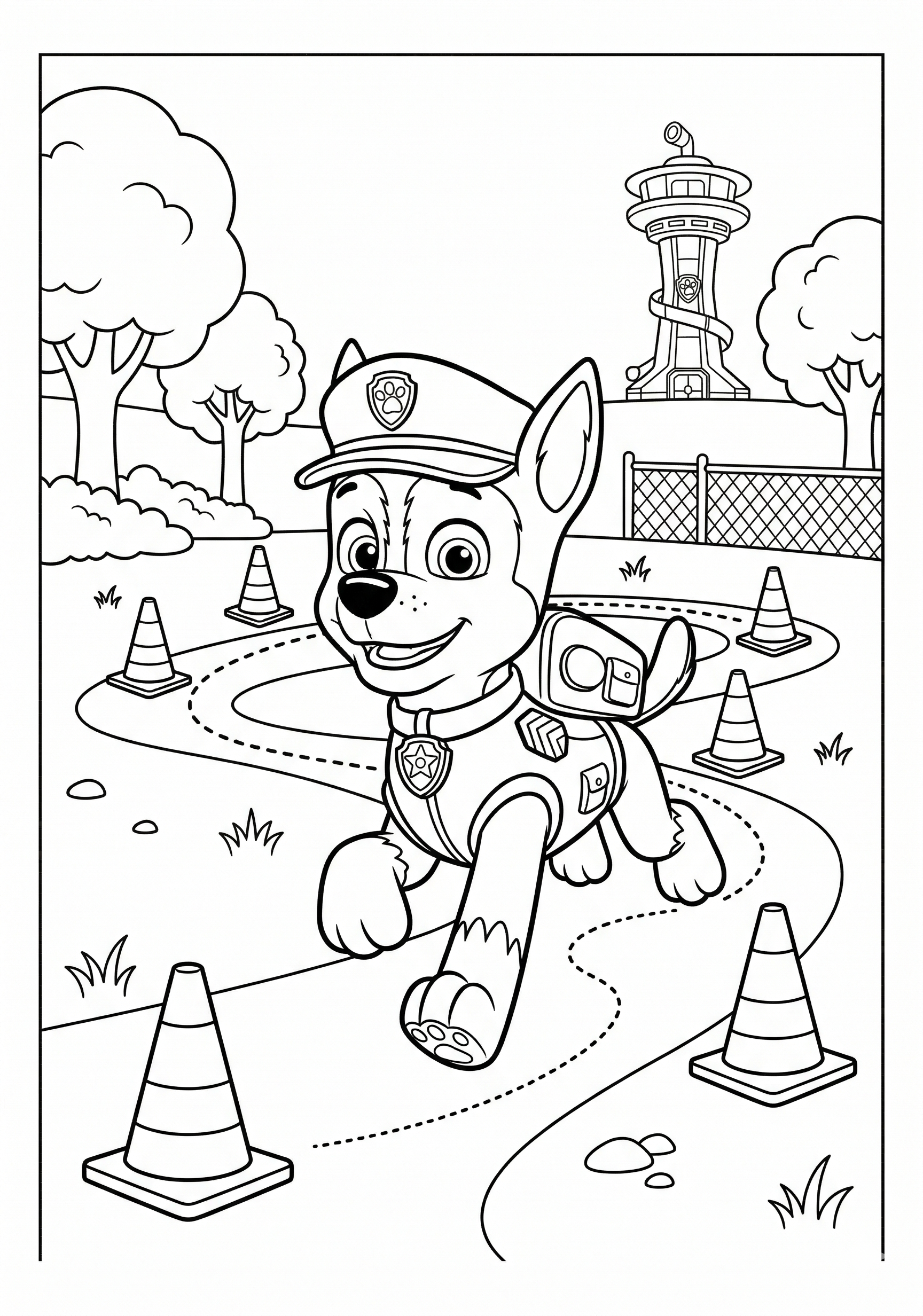 Chase Training with Traffic Cones is a free printable coloring page from our Paw Patrol Coloring Pages collection. It’s suitable for kids ages 6-8 and can be downloaded as PDF or image directly at home. No account required — just click Download PDF or Download image above.