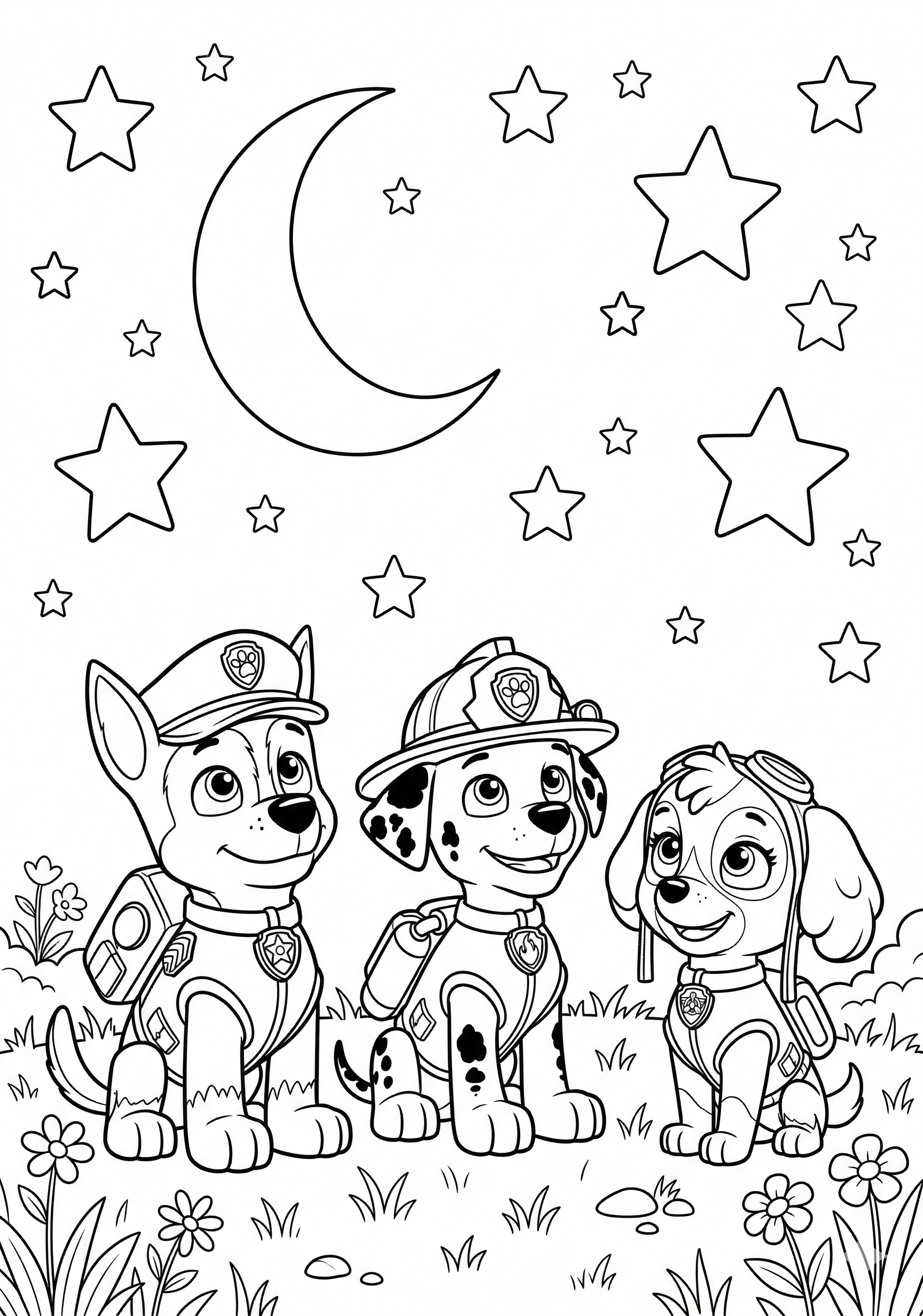 Pups under Night Sky is a free printable coloring page from our Paw Patrol Coloring Pages collection. It’s suitable for kids ages 6-8 and can be downloaded as PDF or image directly at home. No account required — just click Download PDF or Download image above.