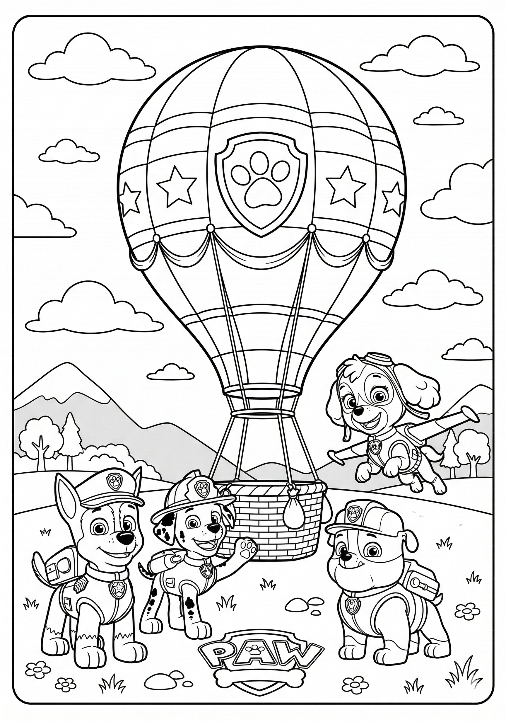 Pups with Hot Air Balloon is a free printable coloring page from our Paw Patrol Coloring Pages collection. It’s suitable for kids ages 6-8 and can be downloaded as PDF or image directly at home. No account required — just click Download PDF or Download image above.