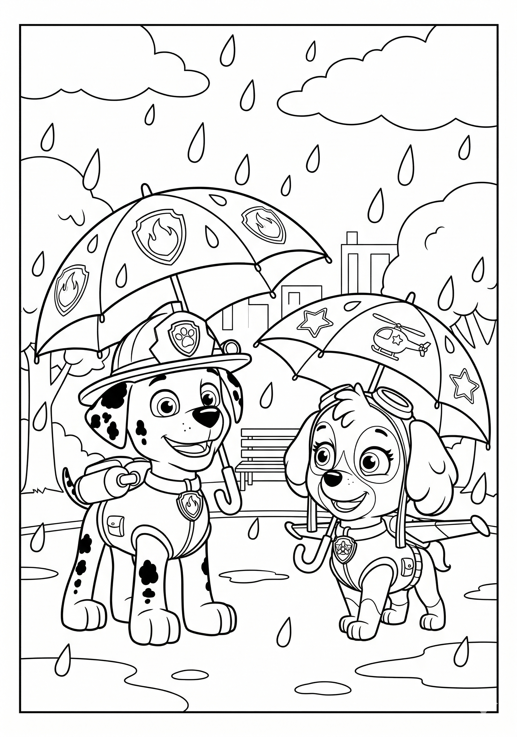 Skye and Marshall Rainy Day is a free printable coloring page from our Paw Patrol Coloring Pages collection. It’s suitable for kids ages 6-8 and can be downloaded as PDF or image directly at home. No account required — just click Download PDF or Download image above.