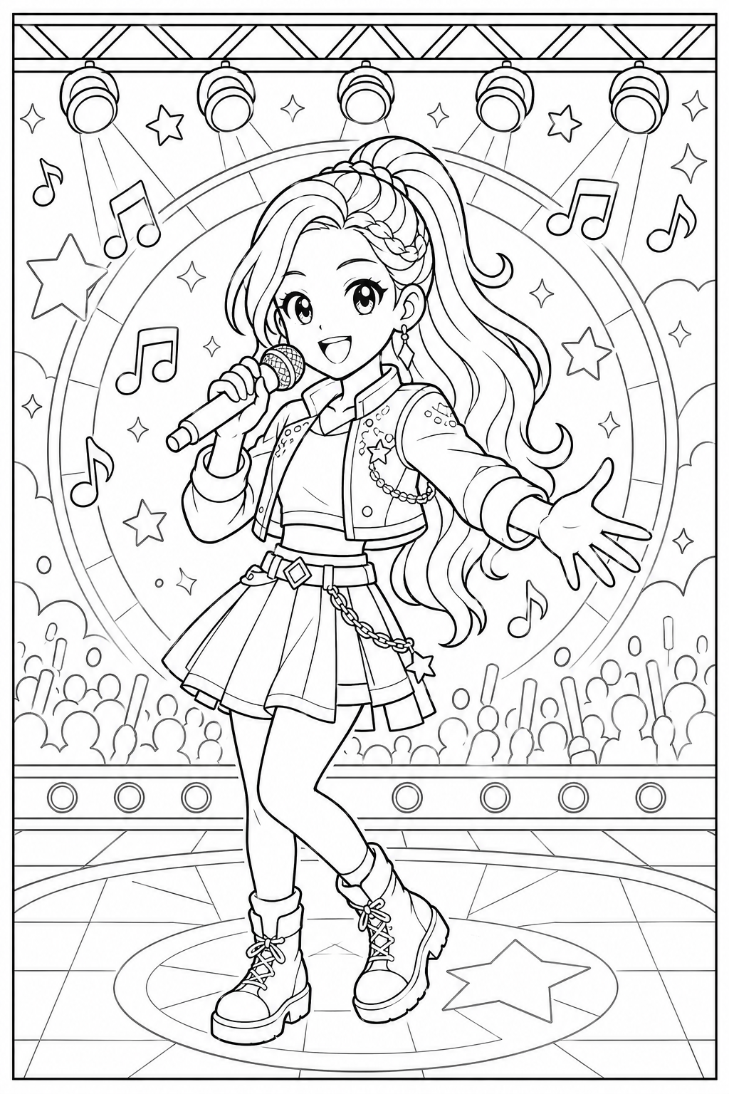 Rumi Singing with Microphone Coloring Page is a free printable coloring page from our Rumi Coloring Pages collection. It’s suitable for kids ages 6-8 and can be downloaded as PDF or image directly at home. No account required — just click Download PDF or Download image above.