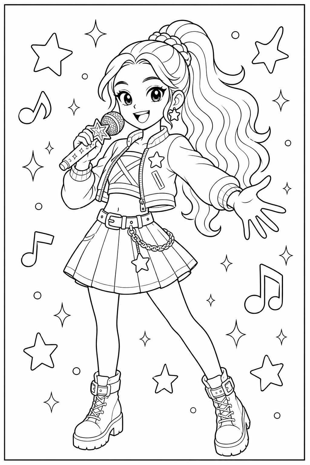 Rumi Sparkle Microphone Coloring Page is a free printable coloring page from our Rumi Coloring Pages collection. It’s suitable for kids ages 6-8 and can be downloaded as PDF or image directly at home. No account required — just click Download PDF or Download image above.