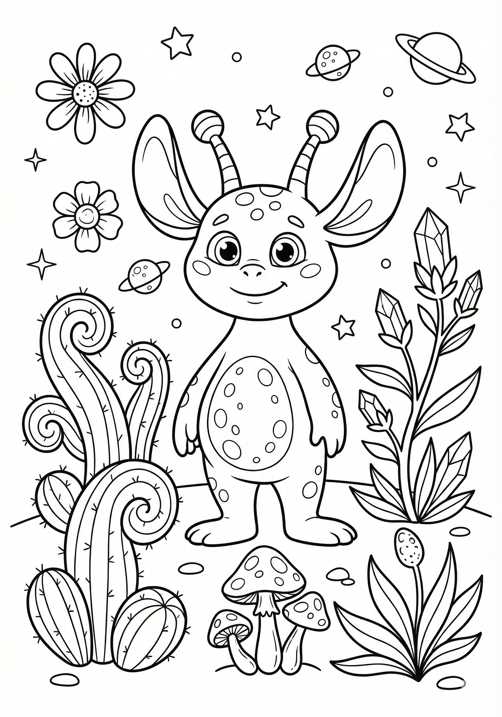 Alien with Space Plants is a free printable coloring page from our Stitch Coloring Pages collection. It’s suitable for kids ages 6-8 and can be downloaded as PDF or image directly at home. No account required — just click Download PDF or Download image above.