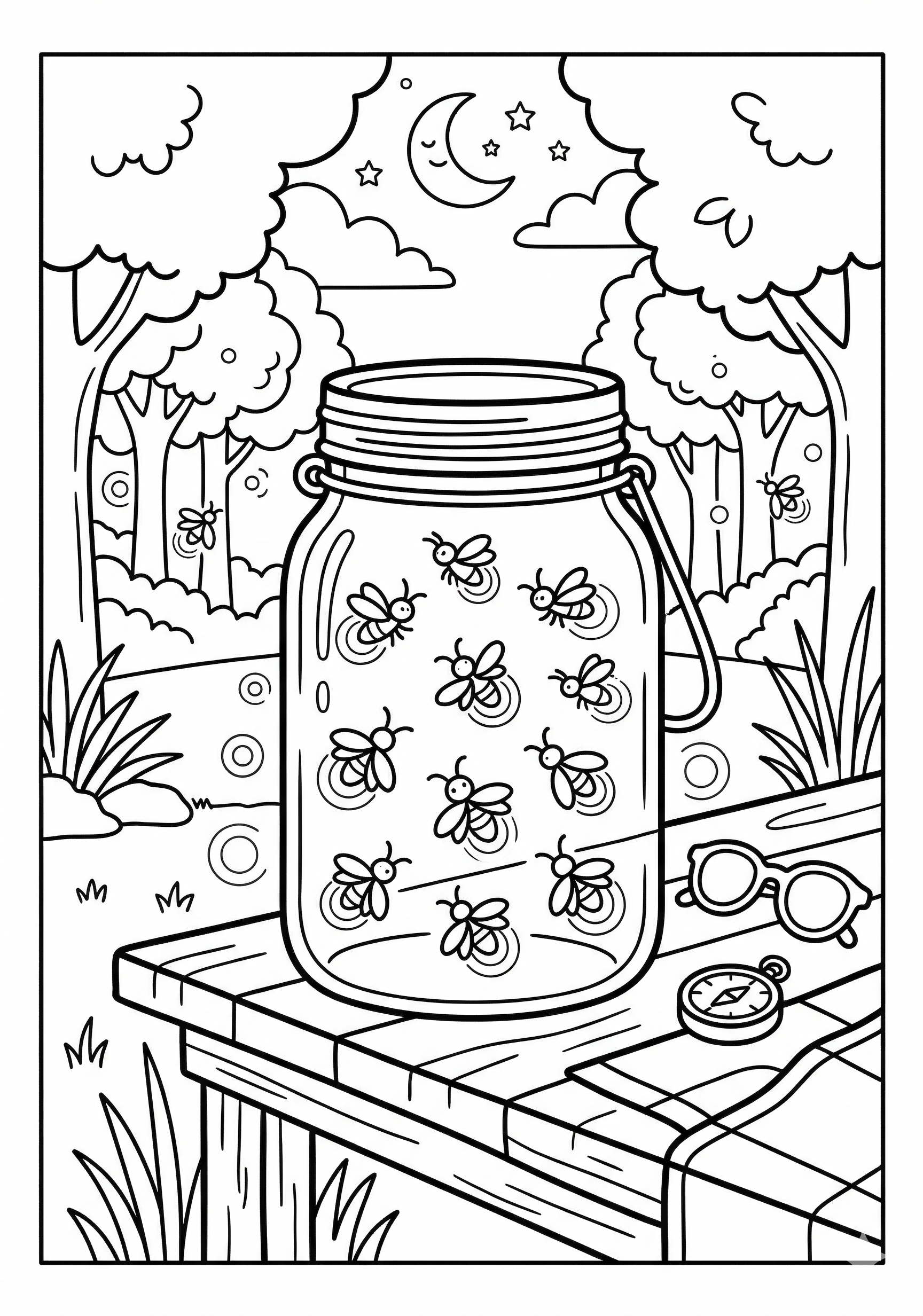 Fireflies in Jar Coloring Page is a free printable coloring page from our Summer Coloring Pages collection. It’s suitable for kids ages 6-8 and can be downloaded as PDF or image directly at home. No account required — just click Download PDF or Download image above.