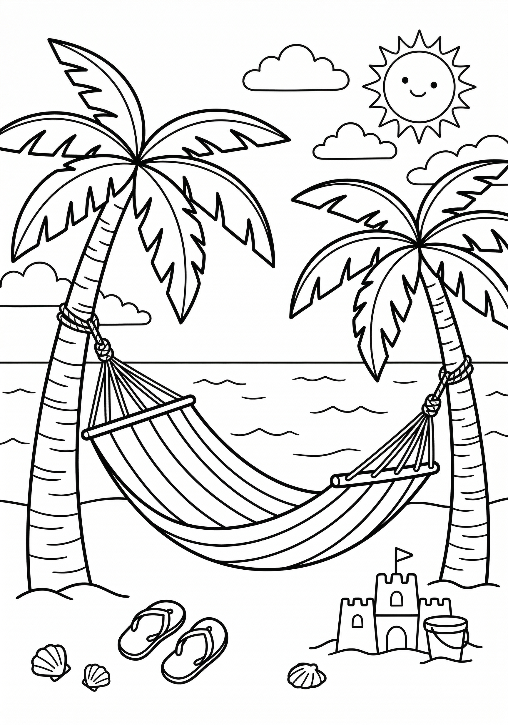 Hammock Between Trees Coloring Page is a free printable coloring page from our Summer Coloring Pages collection. It’s suitable for kids ages 6-8 and can be downloaded as PDF or image directly at home. No account required — just click Download PDF or Download image above.