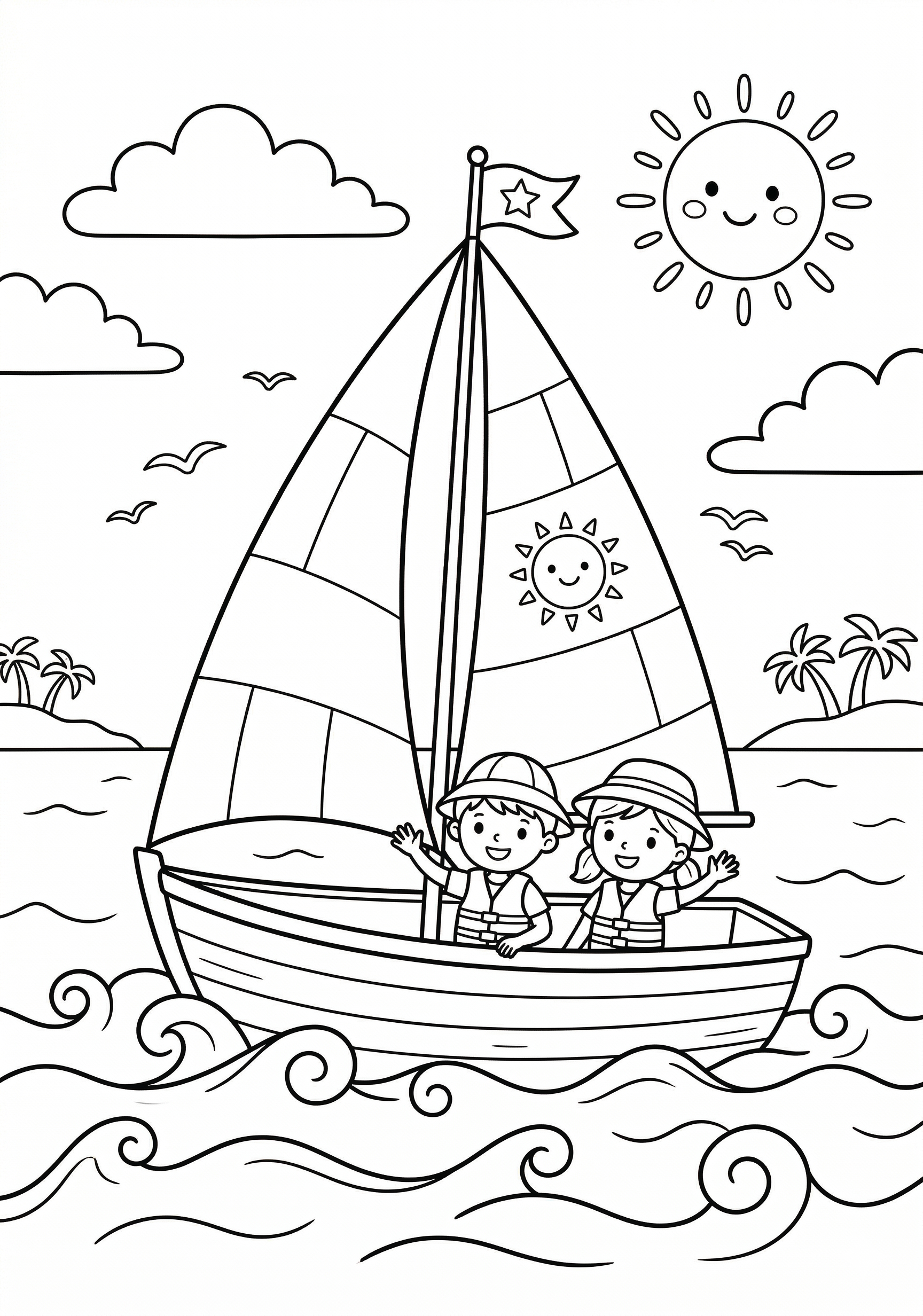 Sailboat on Ocean Coloring Page is a free printable coloring page from our Summer Coloring Pages collection. It’s suitable for kids ages 6-8 and can be downloaded as PDF or image directly at home. No account required — just click Download PDF or Download image above.