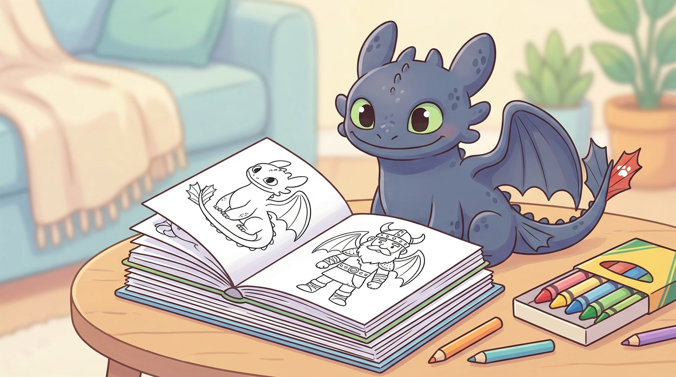 For toddlers and preschoolers, use chunky crayons or washable markers and stick to a few colors so the activity doesn’t get overwhelming. You can suggest “night” colors for Toothless (blacks, dark blues, purples) or “sky” colors for flying scenes. Older kids can try shading, adding scales or flames, and drawing backgrounds like clouds or the village of Berk.